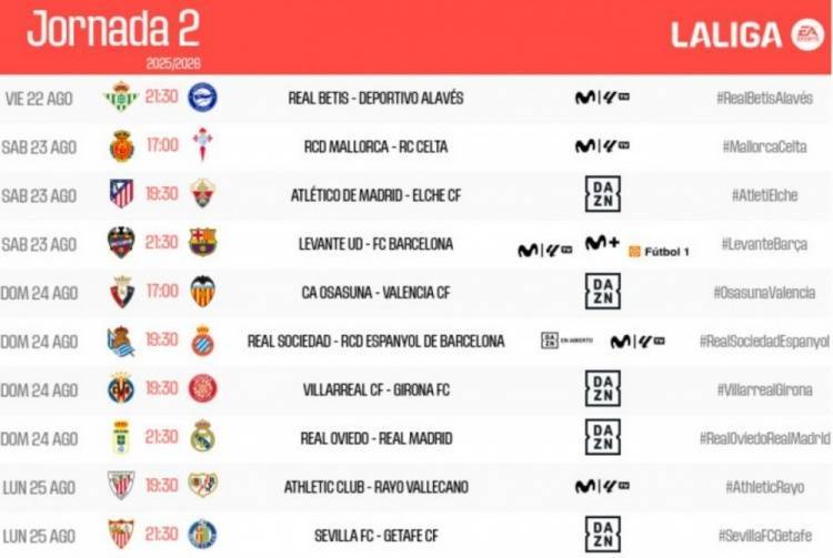 西甲公布联赛第二轮对阵:皇马和巴萨均在客场对阵本赛季升班马